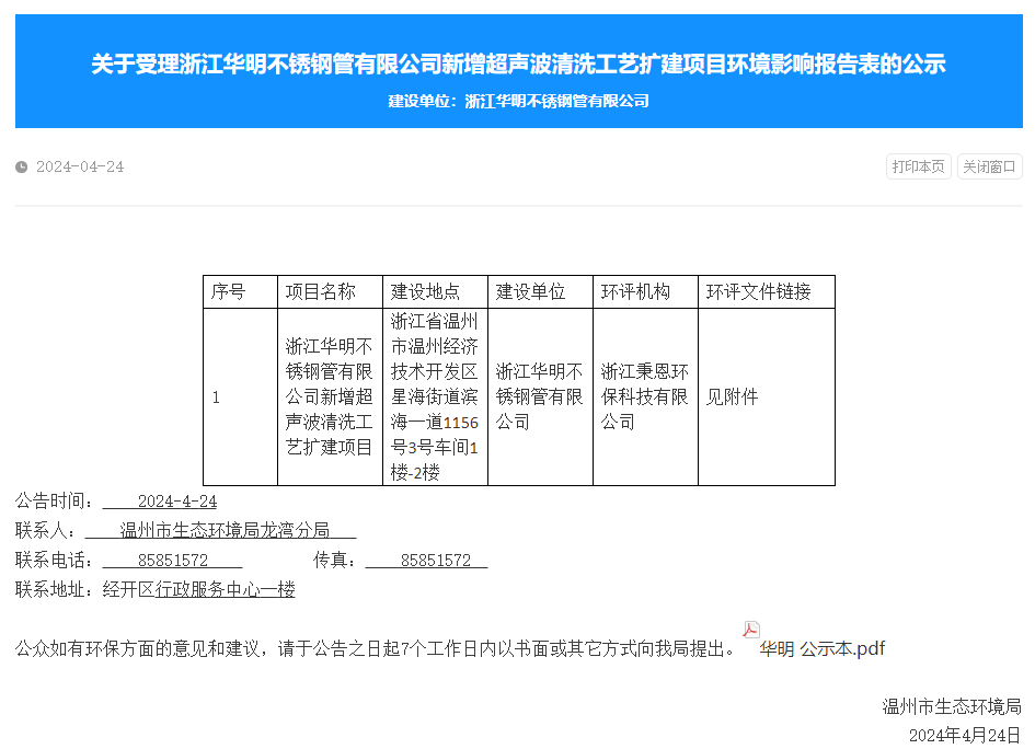 4月24日,溫州市生態(tài)環(huán)境局受理浙江華明不銹鋼管有限公司新增超聲波清洗工藝擴(kuò)建項目環(huán)境影響報告表并對外進(jìn)行公示,公示期:7個工作日。