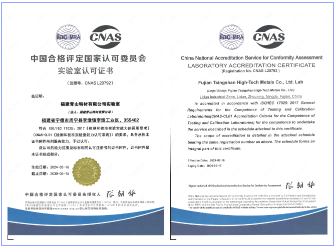 近日,福建青山特材有限公司實驗室經過嚴格的評估和審核,成功獲得了中國合格評定國家認可委員會(CNAS)的認可,標志著該實驗室在檢測和檢驗等領域的能力和技術水平已達到國際認可的標準。